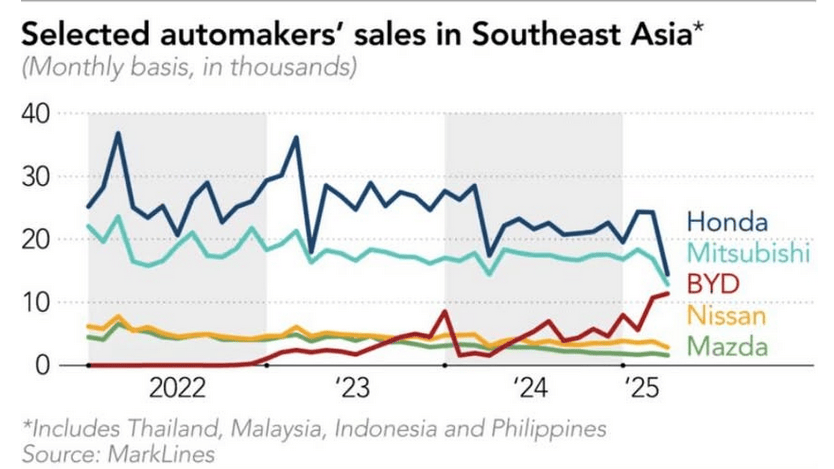 普華永道數據顯示,2025年上半年,以豐田、本田和日產為首的日本汽車制造商,在東南亞6大市場的汽車銷量中所占份額,已由2021年的73%降至62%。在這個年銷量達到330萬輛的市場上,中國汽車份額已從微不足道增加到5%以上。