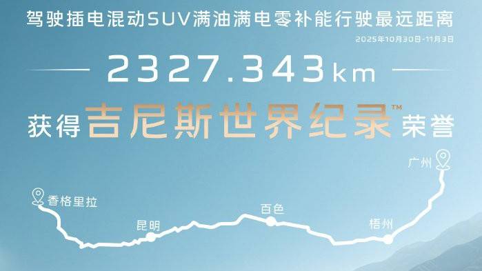 11月初,紅旗HS6 PHEV在吉尼斯見證下,從香格里拉出發(fā),途經(jīng)昆明、百色、梧州等城市,最終于11月3日的早10:15分抵達(dá)廣州,滿油滿電行駛2327.343公里,獲得“駕駛插電混動SUV滿油滿電零補(bǔ)能行駛最遠(yuǎn)距離”吉尼斯世界紀(jì)錄™榮譽(yù)。